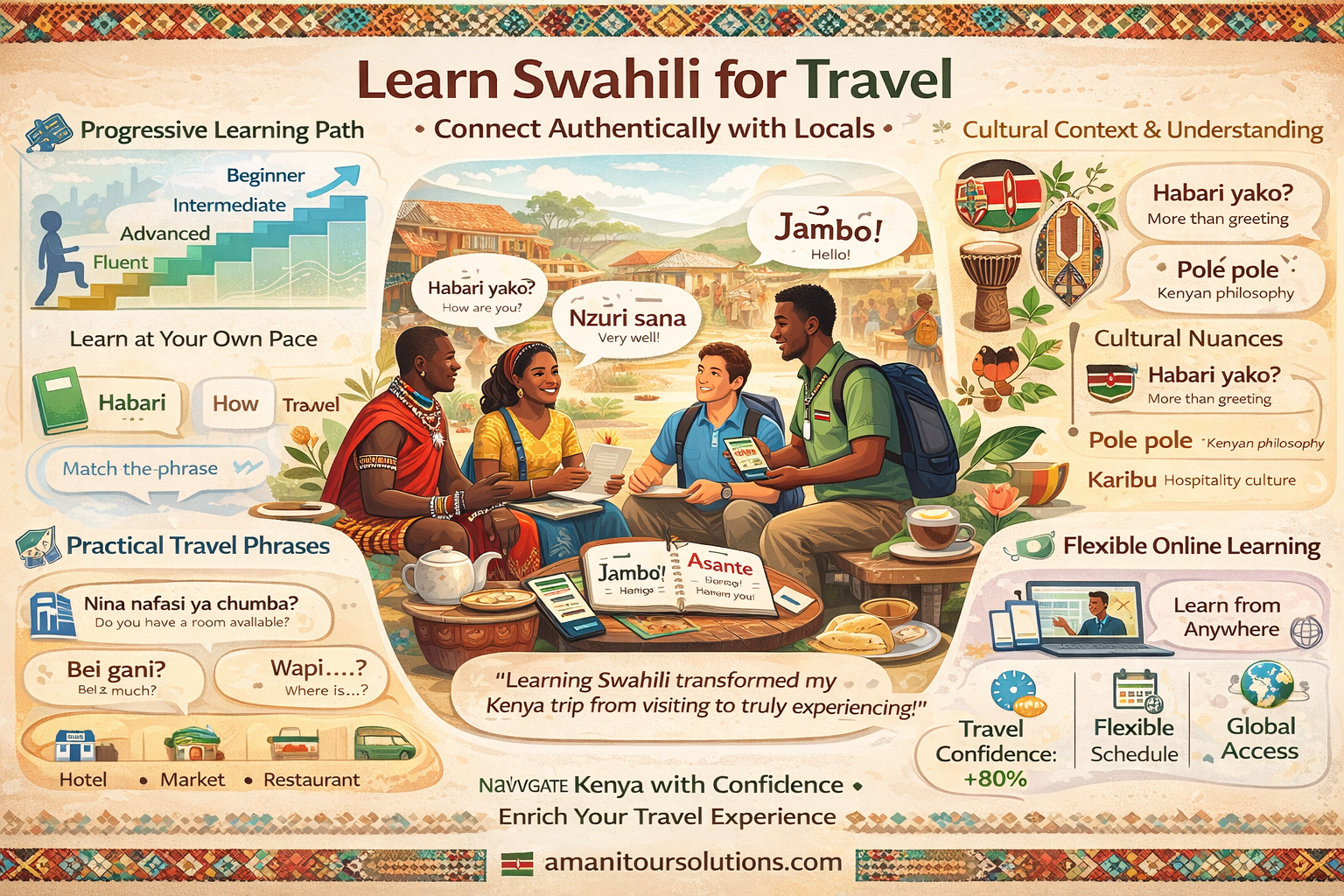 Immerse yourself in Kenyan culture with our Swahili language lessons, designed for travelers of all levels. Learn practical phrases, cultural context, and conversational skills for a richer travel experience.
