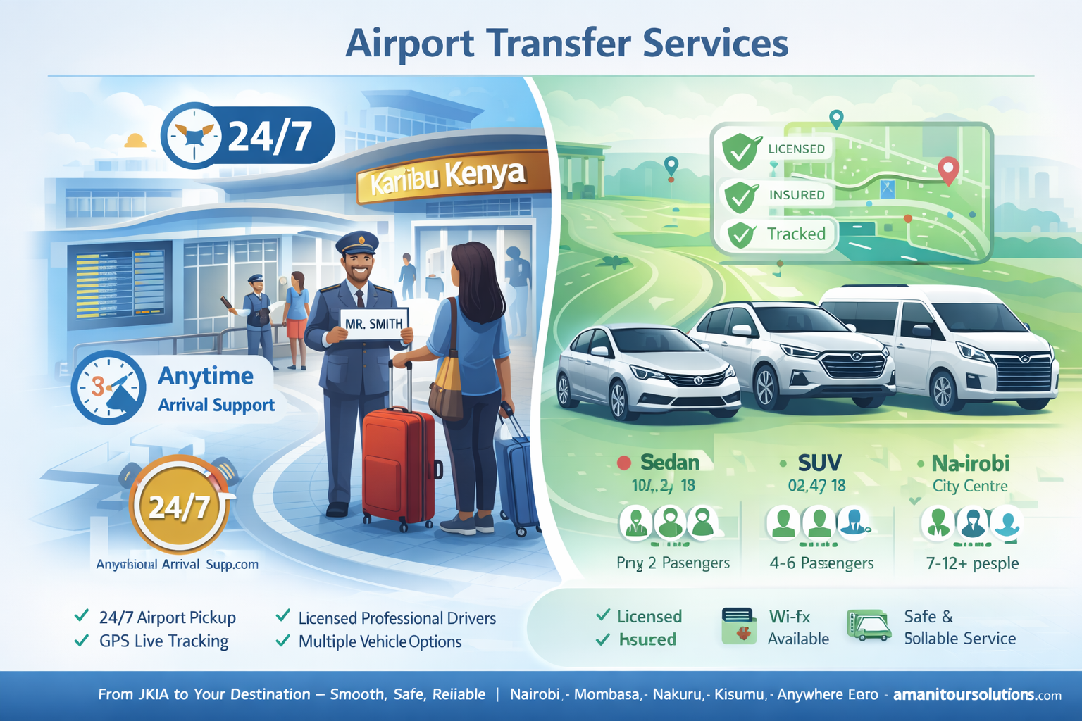 Travel with ease from JKIA to any destination in Kenya with our comfortable and professional airport transfer service. Perfect for both business and leisure travelers, our airport transfers focus on safety, convenience, and reliability.